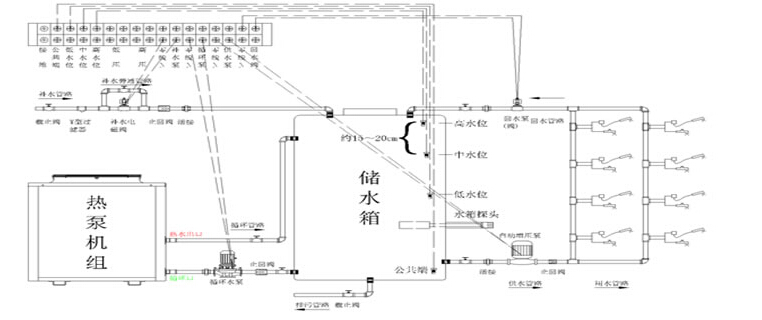 控制系統(tǒng):采用全自動控制,主機(jī)循環(huán)加熱蓄水水箱到60℃,水箱水位下降時(shí),機(jī)組再自動開啟向水箱中補(bǔ)充水。
