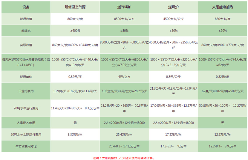 超低溫空氣源熱泵熱水器較電熱器節(jié)約近75%,較燃?xì)鉄崴鞴?jié)約59%、較燃油熱水器節(jié)約62%、較燃煤鍋爐節(jié)約30%、較太陽能熱水器節(jié)約28%的運(yùn)行成本。